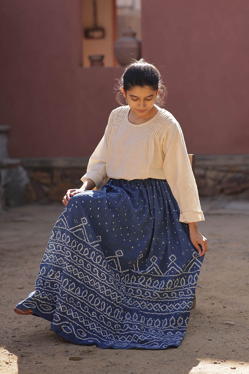 Celebrate timeless craftsmanship with this Handmade Bandhani Skirt Pado, crafted from handwoven Kala cotton by skilled Bandhanara (tie-dye) artisans of Kutch, Gujarat.