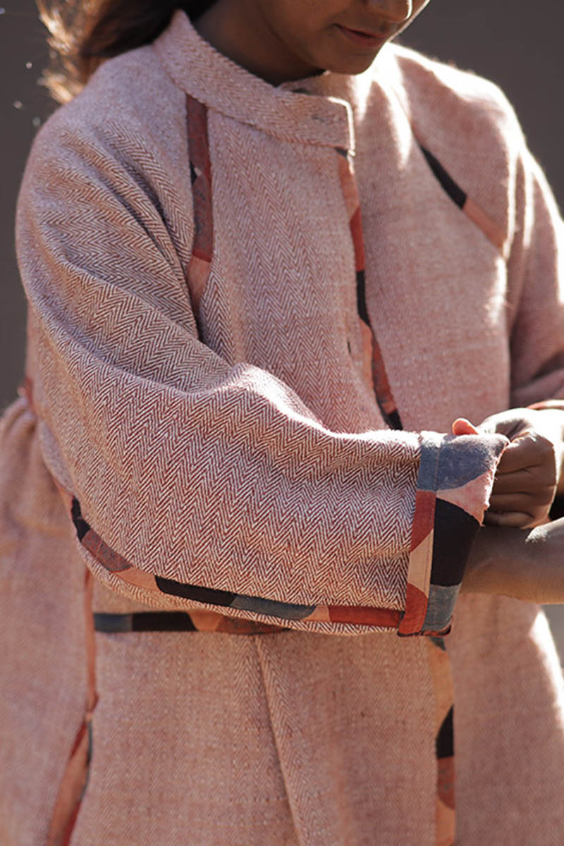 Handspun and handwoven by skilled artisans, the wool is naturally dyed and finished with a soft tweed texture. The inner lining is made from hand block printed fabric, adding an artisanal touch inside the garment. Designed with two functional pockets, this coat keeps the palms warm while offering everyday comfort and utility.